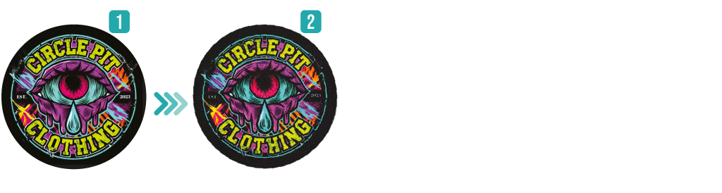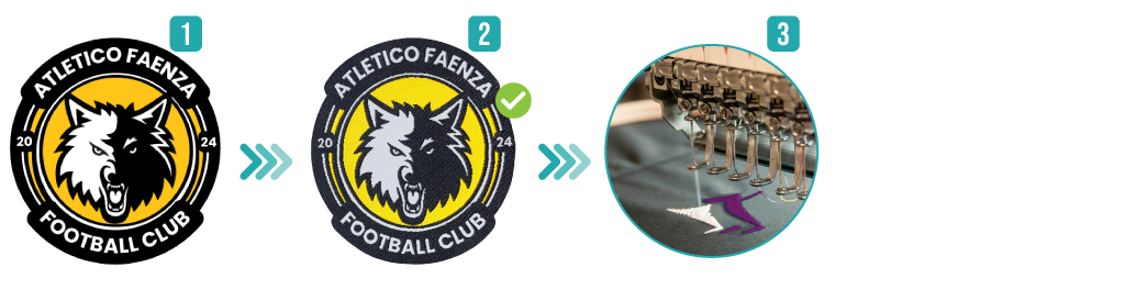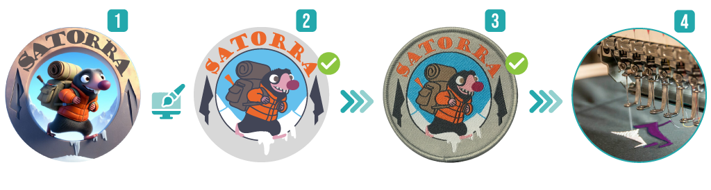Para pequenas modificações (ou se o ficheiro já estiver correto), o nosso laboratório intervém diretamente, sem custos adicionais. Após carregar o seu ficheiro (1), receberá um exemplo fotográfico da sua patch (2)  para aprovar antes de iniciar a produção (3).